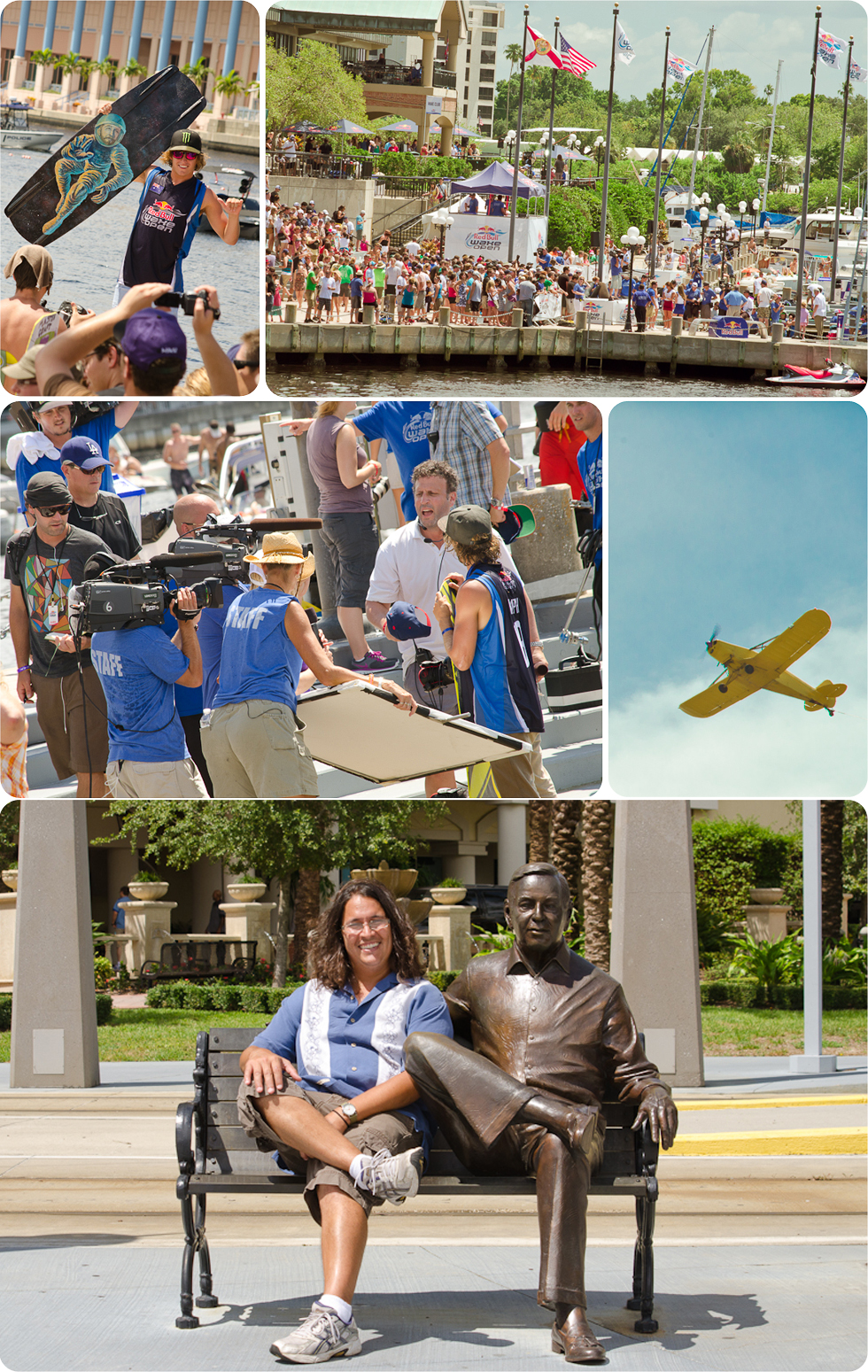 Last weekend, RJ and I met up with the Peterson family as wakeboarders from all over the world descended on Tampa for the Red Bull Wake Open. The art and sport worlds combined at the event with the Wake Art Project, curated by Kick Start My Art. Local artists were asked what gives them wings (this is Red Bull, after all) and were given wakeboards to create a piece showing just that. RJ was one of the artists selected for the show, and created his board “Captain Awesome,” which depicts his son Duncan as a superhero (with his trusty pup Nor-man by his side). We were thrilled to learn that RJ’s board placed second and we were on hand to watch as his piece was awarded to Raphael Derome, the big winner of the Wake Open! Highlights of the competition, and a shot of Raphael with RJ’s board can be found here🙂